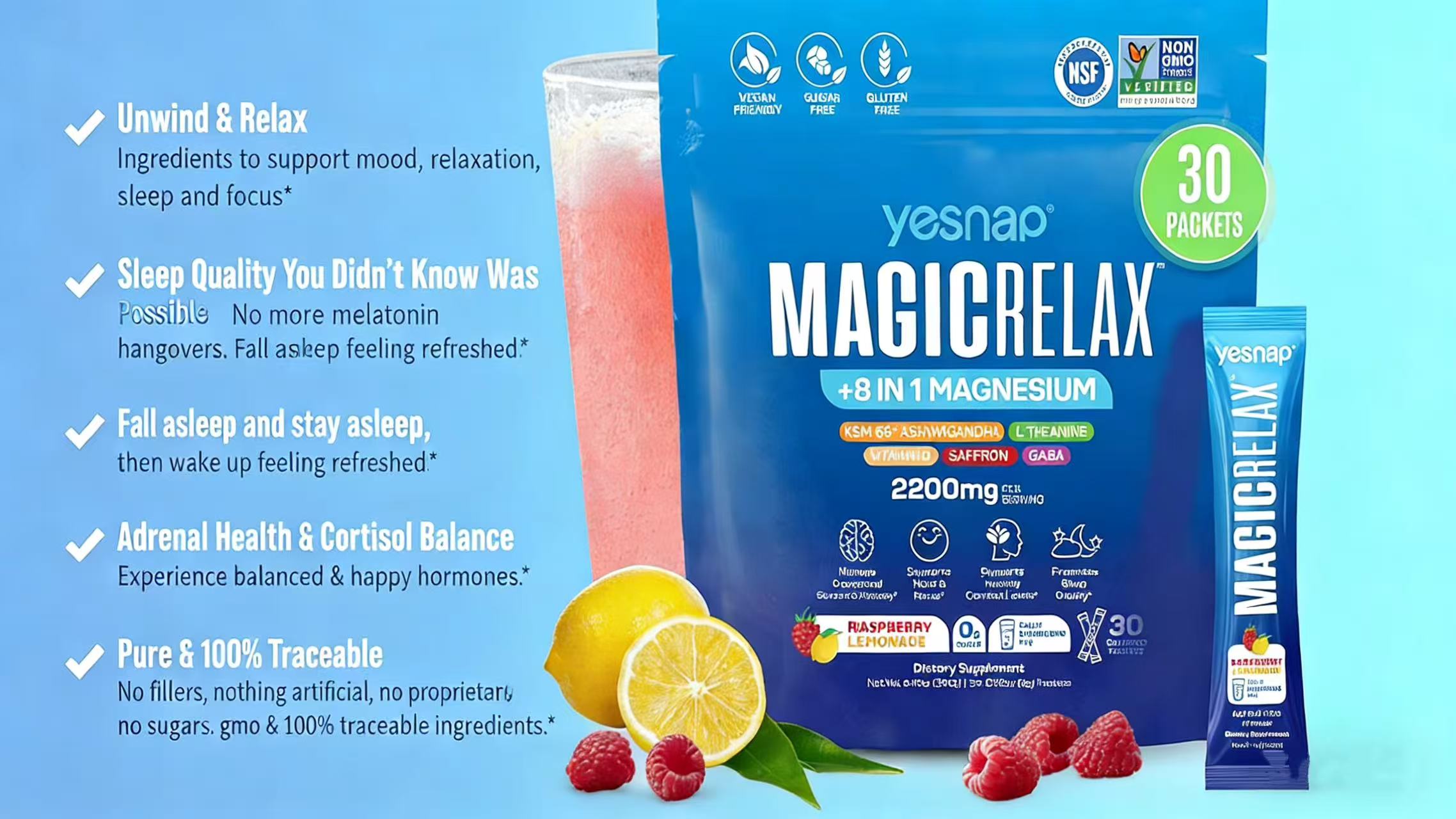MAGICRELAX is a sparkling drink mix formulated with an 8-in-1 calming blend. It’s designed to help you relax, unwind, and enjoy a moment of calm — without pills, alcohol, or caffeine.